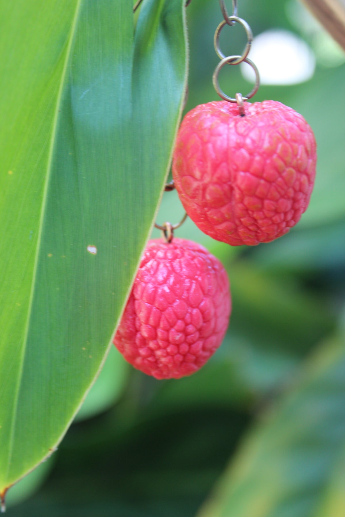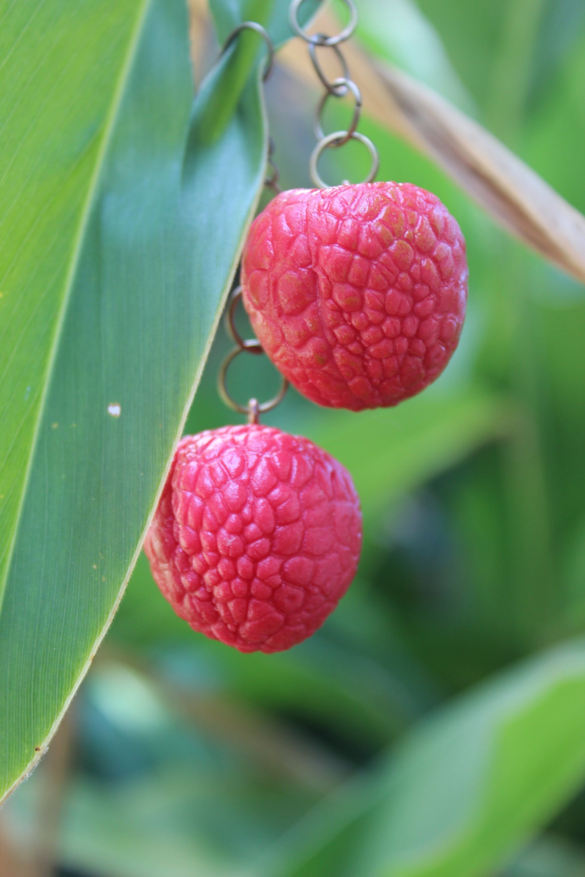 Super juicy and hyper-realistic, these handmade lychee earrings are crafted in Thailand from lightweight polymer clay and hang on a delicate brass chain + hook. About 2 inches long, they look like tiny berries and add the sweetest pop of fun to any outfit.