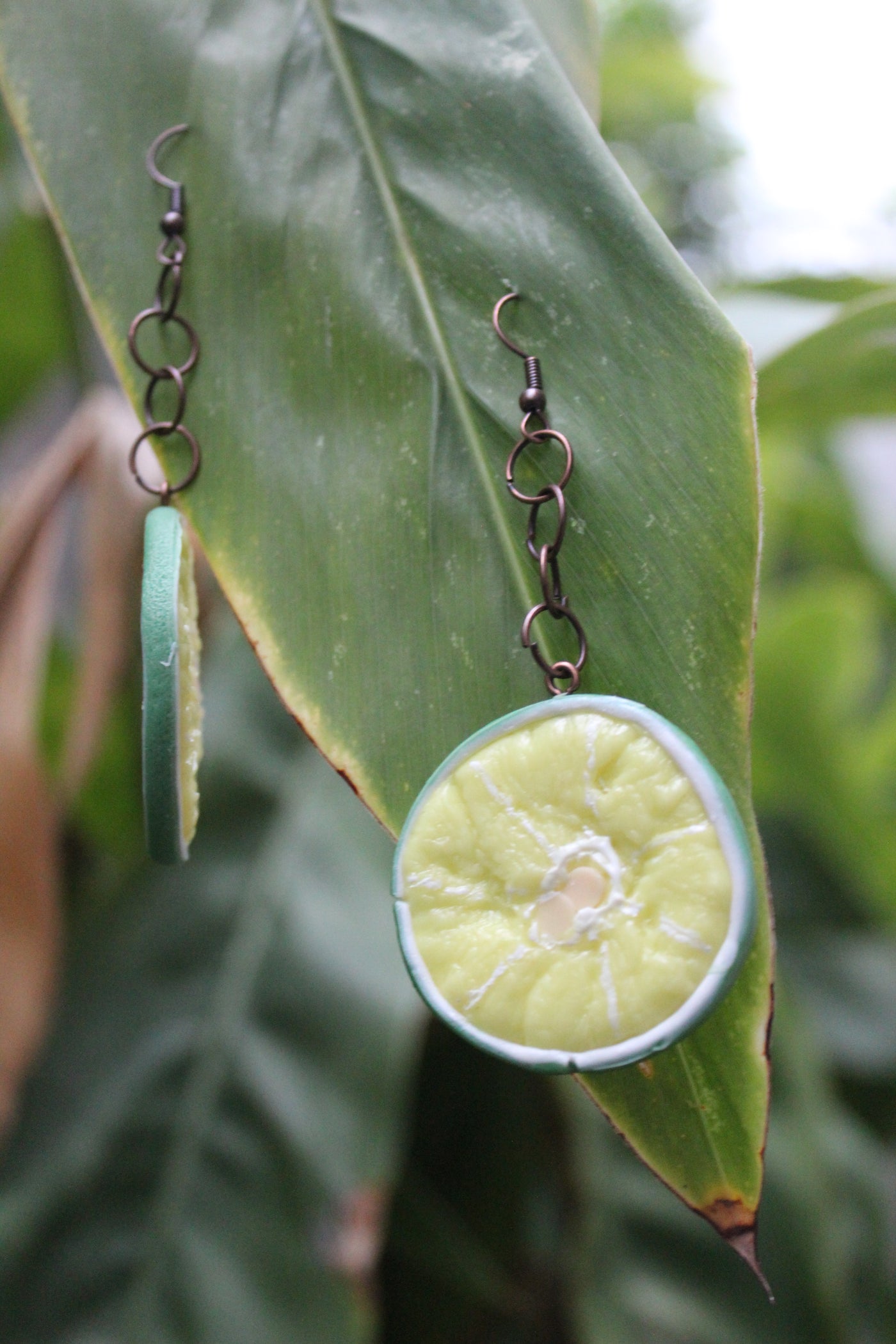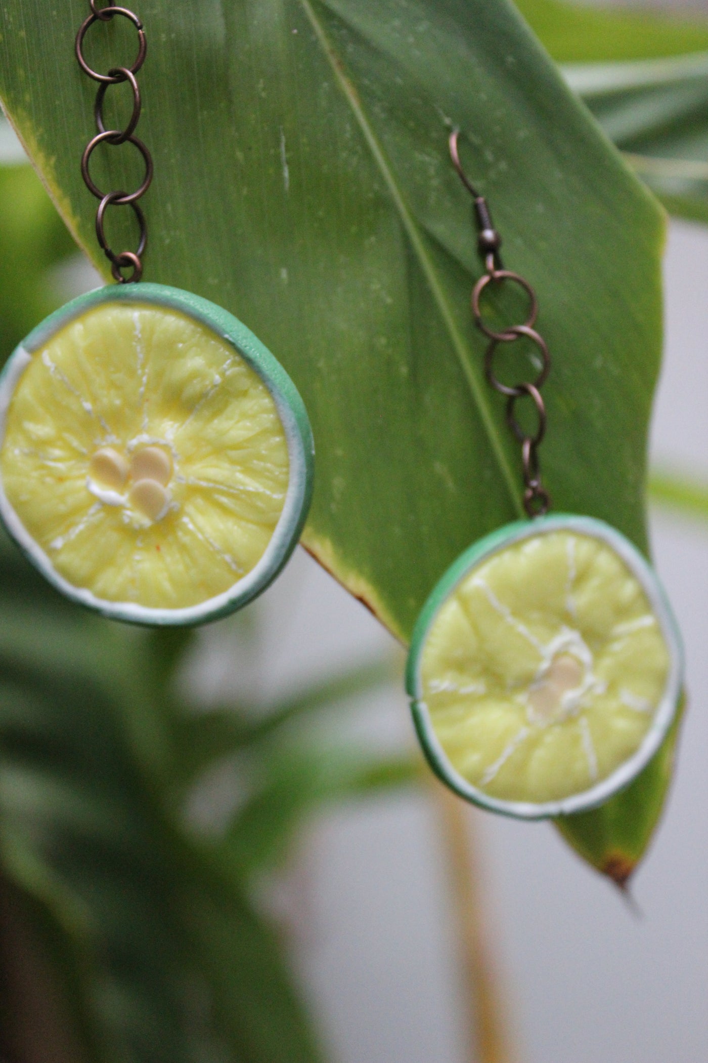 Brighten up your style with our vibrant Sliced Lime Earrings! Each earring is crafted from clay to capture the fresh, zesty look of a lime slice, adding a splash of color and charm to any outfit. Hanging from a brass hook, these earrings make a playful statement and are perfect for fruit lovers or anyone wanting a touch of citrus-inspired flair. • Length: 3 inches • Weight: 7 grams